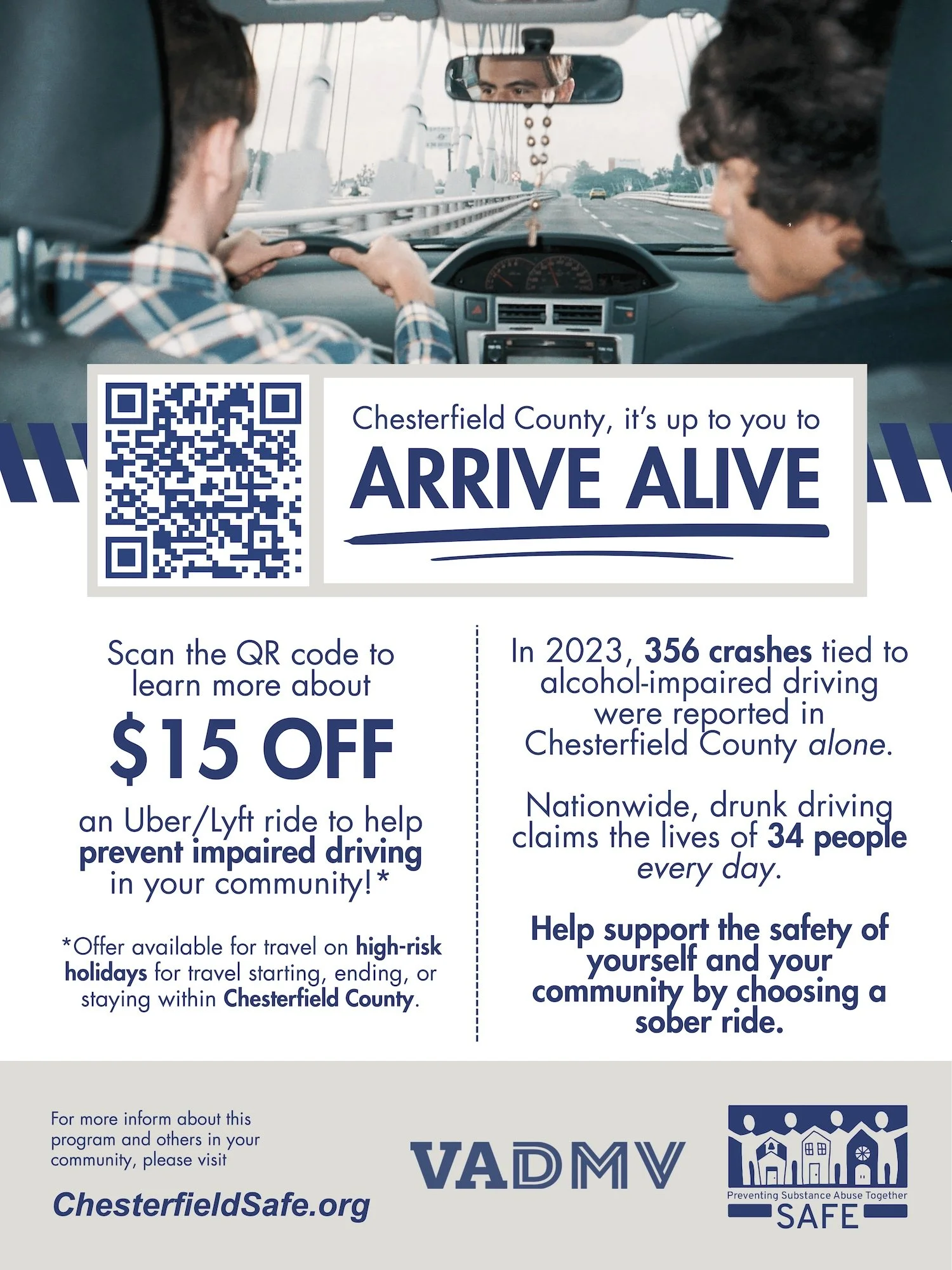 To help keep our community safe, SAFE’s “Arrive Alive Chesterfield” program provides free or reduced-cost rides to prevent impaired driving during high-risk holidays.