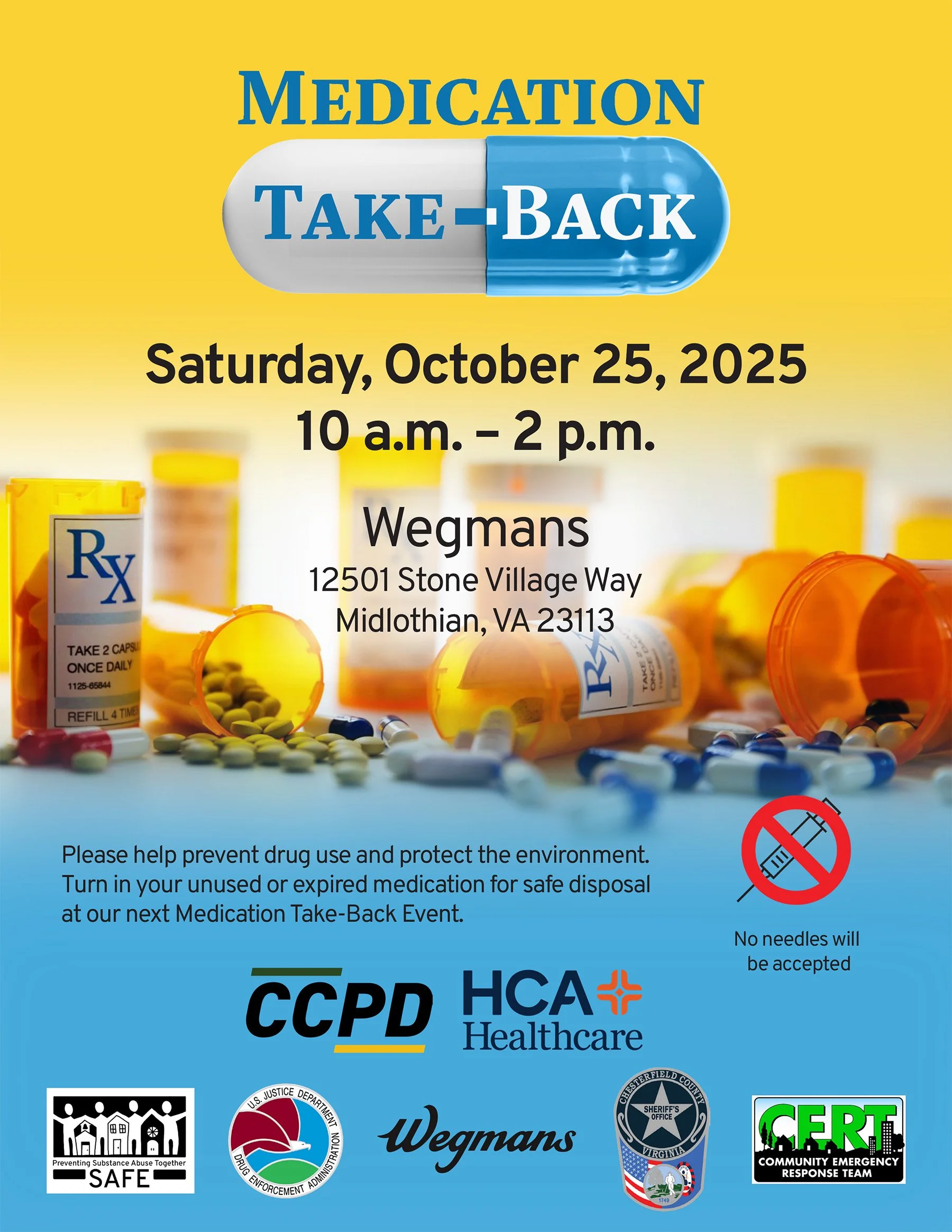 Medication Take Back | Oct 25th Saturday, October 25, 2025 10:00 AM 2:00 PM Wegmans 12501 Stone Village Way Midlothian, VA, 23113 United States (map) Google Calendar ICS Please help prevent drug use and protect the environment. Turn in your unused or expired medication for safe disposal at our next Medication Take-Back Event. No needles will be accepted.